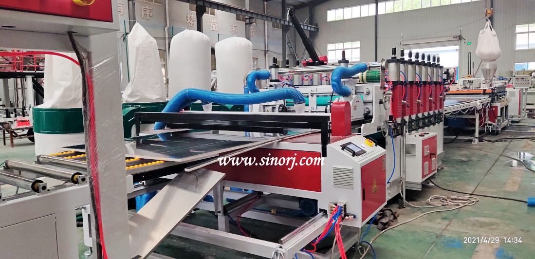 雙螺桿80擠出機、定型平臺、八輥牽引機、橫向切割機、落料架組成。這里說的組成是指純生產線,此外還需要配置擠出板模具、水冷卻定型模具、混料機、破碎機、磨粉機才能完成完整的生產過程。